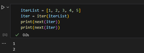 1 2 3 4 iterList = [1 , 2 , 3 , 4 , 5 ]iter = iter (iterList) print (next (iter ))print (next (iter ))