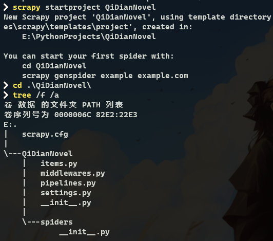 1 2 3 4 5 6 7 8 9 10 E:. | scrapy.cfg \---QiDianNovel | items.py | middlewares.py | pipelines.py | settings.py | __init__.py \---spiders __init__.py