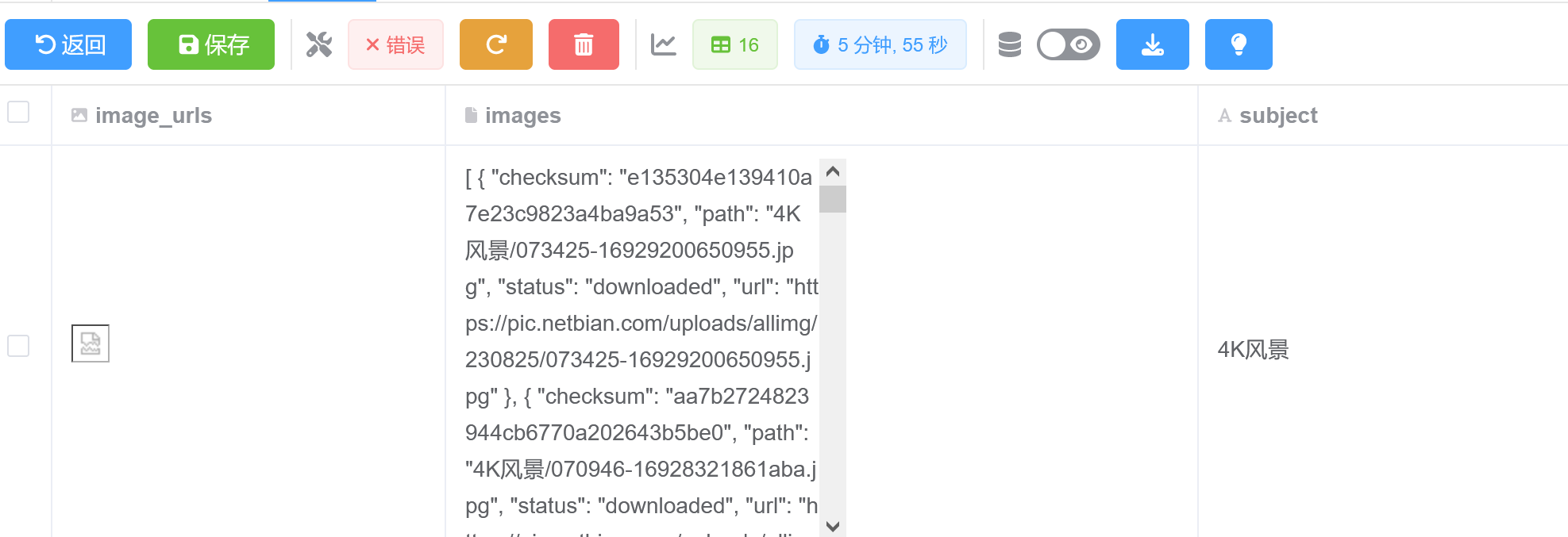 爬取结果如下图所示: 也可以将爬虫文件上传至 ScrapyLab 中执行任务,得到如下结果: