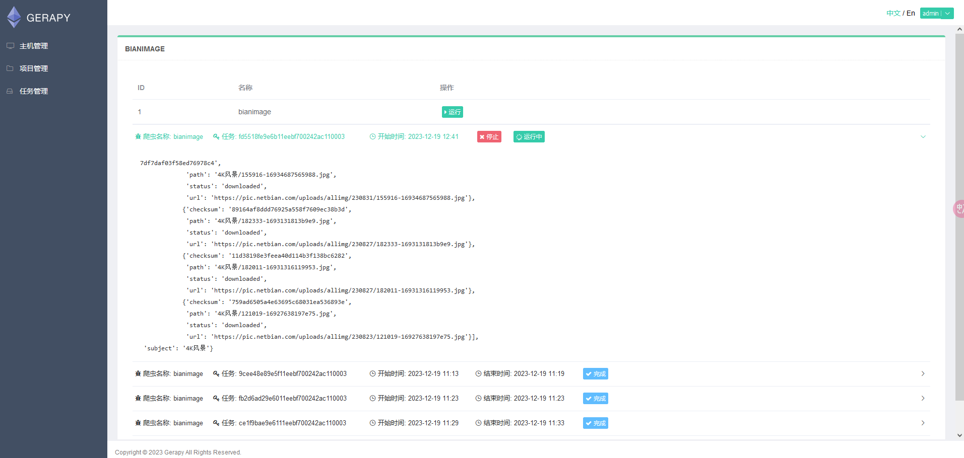 启动项目 回到主机管理点击主机节点的调度,进去后可以看到运行和任务运行状态日志等信息,可以点击运行即可启动爬虫项目,结果如下图所示: